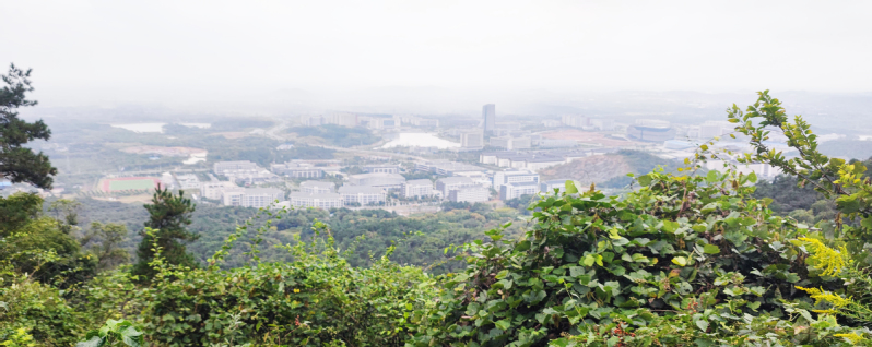本次登山以十里长山南麓长风路与长津路交叉口为起点、米芾书法公园东门为终点,总路程约5公里。下午一点半,大家准时到达桃花山庄集合点,踏着碎石路开始了本次的登山体验活动。大家一路上欢声笑语,你追我赶,穿梭在林间小道,尽情地欣赏着金秋美景,呼吸着大自然清新的空气。到达山顶,远眺江科大长山校区,最显眼的还是海韵湖与文理大楼。