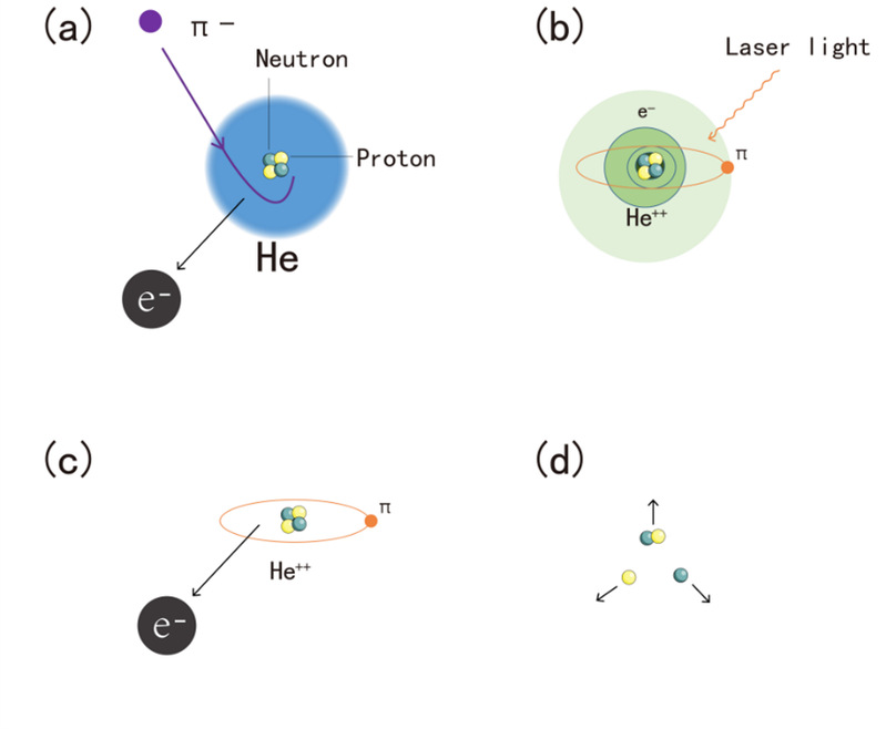 在鲍威尔发现宇宙射线中π介子的同年,“原子能之父”著名物理学家费米等人预言π-介子取代正常原子中的电子后可以形成各种奇异原子。这些奇异原子像“容器”一样将π-介子存储在分立原子轨道上,使我们可以利用激光技术加以研究。PSI 拥有领先世界的高亮度 1.3 MW 质子环形回旋加速器,这使得 PiHe 合作组能够获得高通量的π-介子束流。如图所示,π-介子束流轰击氦靶,会将氦原子的一个基态电子敲掉并占据该电子的空间位置,并被较为稳定的亚稳态轨道“囚禁”起来。这些独特的亚稳态轨道与原子核距离较远,因此可以保护π-介子在几十纳秒之内不被原子核俘获,这使得激光光谱探测成为可能。随后,剩余的一个电子也被发射出去,π-介子落入低轨道并被原子核吸收,核裂变反应产生质子、中子和氘核。