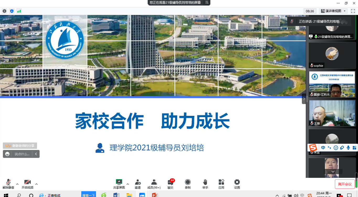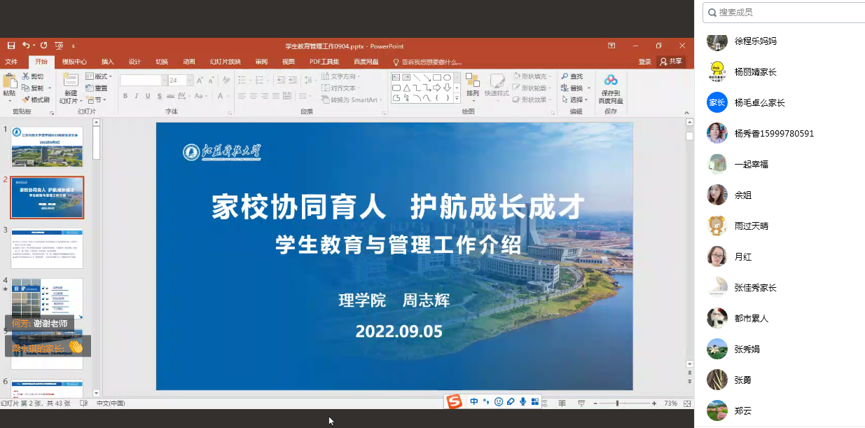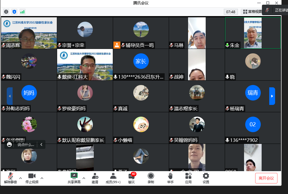 9月5日晚,太阳成集团122ccvip召开2022级本科新生家长腾讯会议,全体院领导,2022级本科生辅导员、学业导师,高年级员工代表及新生家长等共300余人共聚云端,共同交流2022级员工的教育培养。会议由公司党委书记朱金主持。