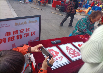 会场布置完成后,交流会各项活动陆续开展。在公益服务区,志愿者们提供糖画、面塑、剪纸等非遗文化教学,来参观的市民可亲自学习制作过程,并体验理发、推拿、采耳等便民服务,以及垃圾分类、防诈骗、法律知识等咨询讲解服务。