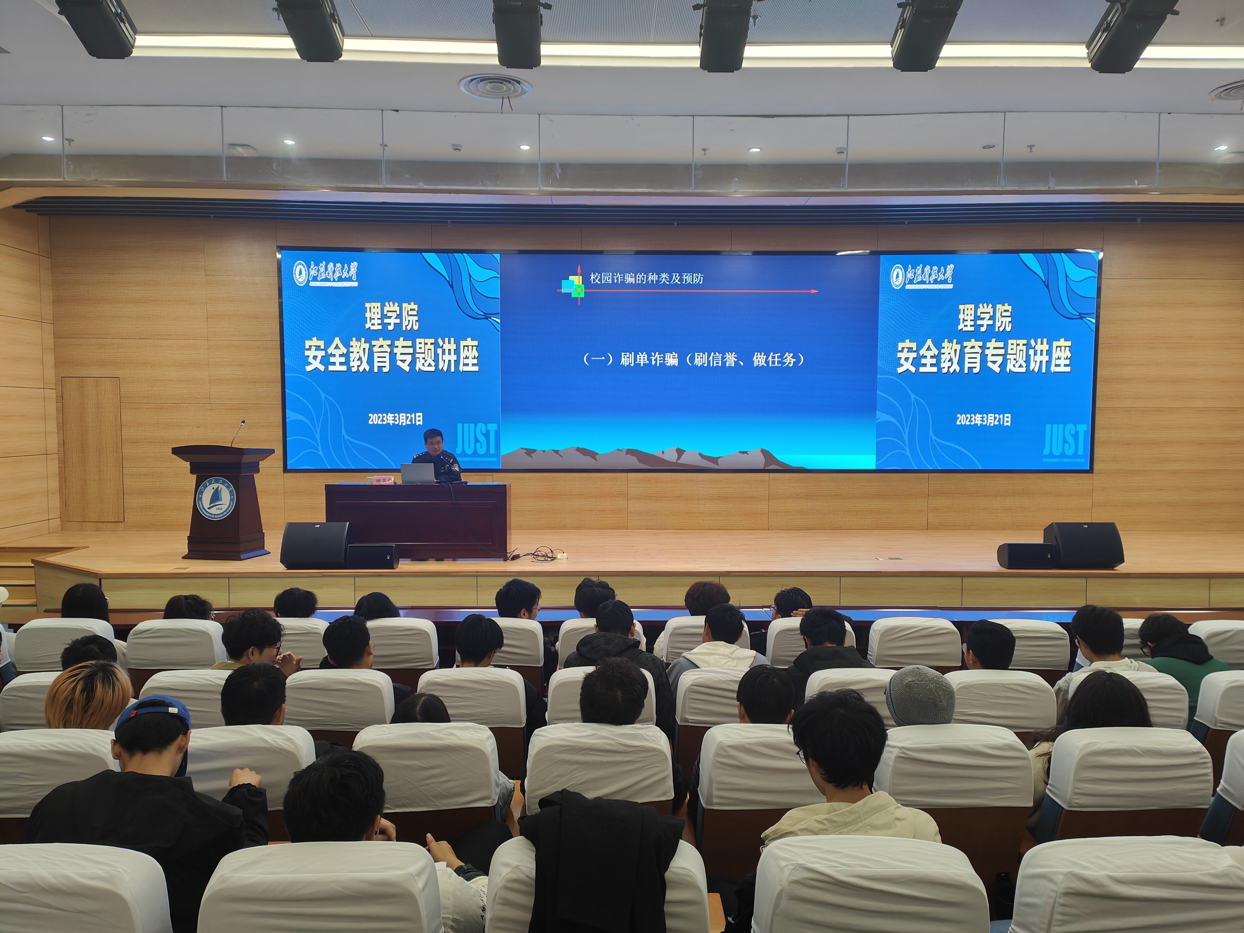 娜晟东副所长用贴近员工的话语,向同学们生动详细地介绍了刷单诈骗,冒充客服要求退款、赔偿类诈骗,盗取同学、亲朋好友社交账号诈骗等7类校园诈骗及其预防措施。他列举了许多发生在高校园区的高频诈骗案例,告诫同学们要不断提高防范意识,遇到疑似诈骗要沉着冷静,正确寻求帮助,保护好自己的财产安全。“法律面前没有任何借口”,娜晟东副所长为同学们做了预防“帮信罪”的法治宣传,希望同学们知法懂法守法,共同守护校园安全。