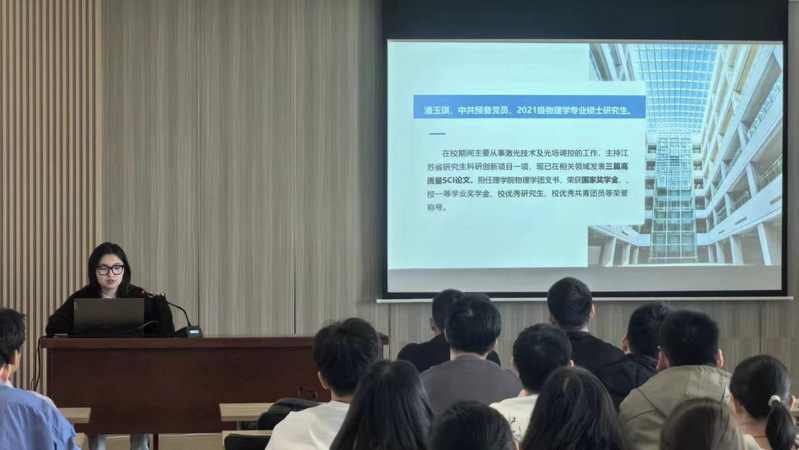 10月26日上午,太阳成集团122ccvip在文理大楼1150报告厅举行研究生国家奖学金获得者学术交流会。国家奖学金获得者、2021级物理学专业研究生邱宗钢和潘玉琪,为2023、2022级全体研究生分享了成功的学术成长经验。活动由研究生辅导员孙叙伦主持。