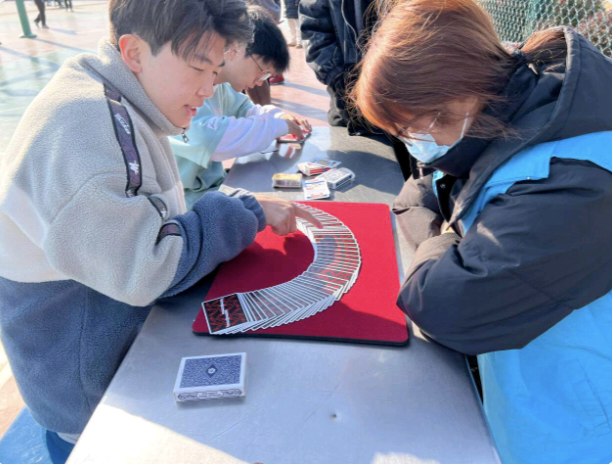12月3日上午9时,女子趣味赛正式开始,女子组虽然没有男子组那样激烈的角逐,但是她们凭借细心和耐心依次完成了木头人、定点投篮、运球绕杆三个趣味活动,展现出了独属于女生的风采——温柔中带有一丝坚定,敢拼搏,不放弃!在活动的中场休息阶段,几位志愿者还为运动员们带来了精彩的魔术表演,既缓解了运动员们在运动后的疲劳感,又调动了大家的积极性。球场上洋溢着欢声笑语,空气中弥漫着朝气。