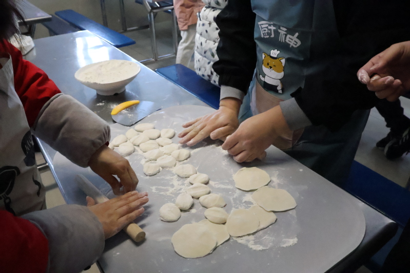 上午十点,老师们和同学们早早来到员工社区和食堂开始忙碌,和面、分馅等忙得热火朝天。包饺子过程中,大家自动分工协作,你擀皮,我包馅,笑语不断,情绪高涨,老师同学们用自己拿手的方法包着各式各样的饺子,切磋包饺子的技巧,现场洋溢着满满的“家”味,处处是温馨的景象。有些同学还用心地将糖果、巧克力包进饺子,让师生时时吃到惊喜。