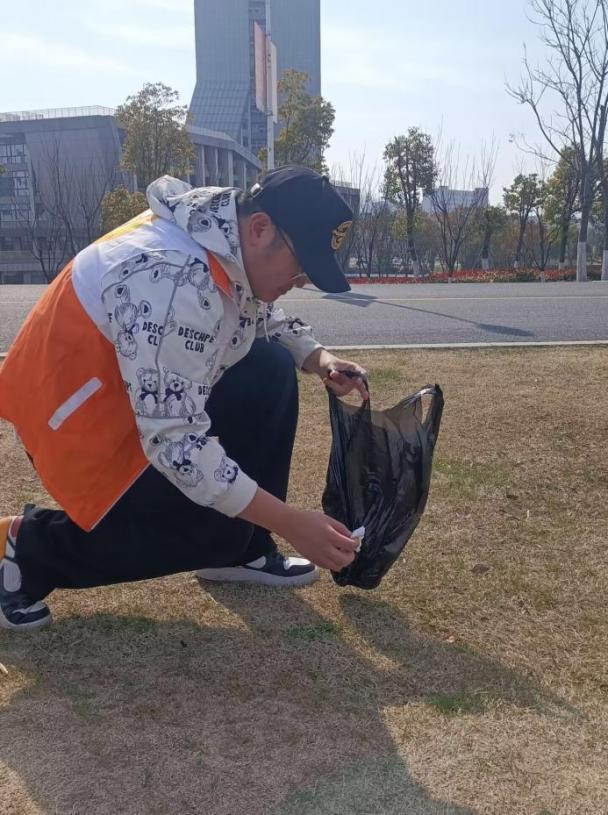 在一番动员后,志愿者们沿路开始了捡拾垃圾之旅。活动过程中,大家积极仔细地搜寻路面、草坪上存在的垃圾,不放过任何一个角落。垃圾袋里断断续续扔入了烟头、纸团、塑料袋等,没想到看似干净整洁的校园也会藏污纳垢。随着志愿者们一路上不断捡拾到各种烟头,联想到最近贵州山火和各种起火事件频发,在此提醒同学们不要随便把烟头扔到草坪上,避免引起火灾。