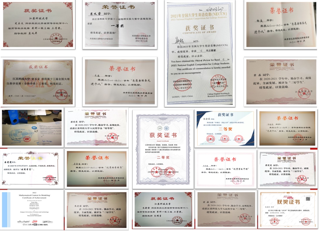 四年来,班级同学在学好专业知识的同时,还在科研、各类学科竞赛和校园文化活动中崭露头角。班级四六级通过率、人民奖学金获奖率均名列前茅,获得公司优良学风班、五四红旗团支部,省级先进班集体等多项综合荣誉,多位同学获得国家奖学金、全国老员工物理竞赛一等奖、美国老员工数学建模竞赛S奖等国家级荣誉近10项;获得江苏省高校老员工物理与科学技术作品创新竞赛一等奖、江苏省高等数学竞赛一等奖、全国老员工数学建模竞赛省级三等奖等省级以上学科竞赛奖项近30项。