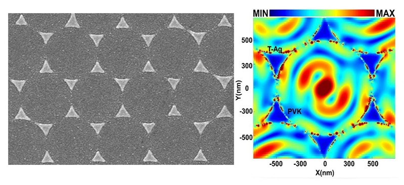 图1. 高度有序三角形金属微结构和器件内部电磁场强度分布示意图