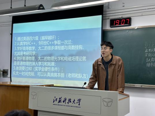 光电信息科学与工程薄宏伟学长侧重于讲述在大学不同阶段需要努力完成的事情。除了扎实学好基础课和专业课,大一要努力通过英语四六级考试,参加自己感兴趣的社团;大二上学期要力争通过计算机二级考试。他为同学们阐述了老员工数学建模大赛和老员工物理实验竞赛的重要性,为同学们讲述了自身备赛经历,鼓励同学们不惧挑战、勇攀高峰。