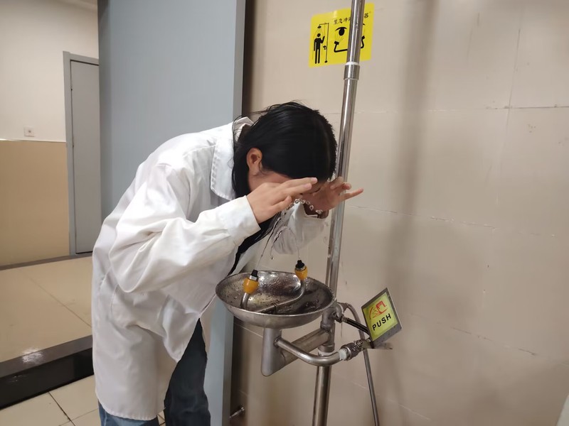 洗眼器作为一种重要的医疗器械,主要用于眼部和颜面的紧急冲洗,当有害物质溅入眼睛时,它能够迅速降低危害程度。整过培训和演练中,指导老师详细讲解了洗眼器的操作步骤:①打开防尘盖,用手轻推手推阀,清洁水从洗眼喷头自动喷出;②立即对准污染部位进行冲洗,冲洗时需用手撑起眼睑,时间至少15分钟;③冲洗之后,用后将手推阀复位并盖好防尘盖,仍有不适,适时就医,并告之导师和实验室及公司负责人。