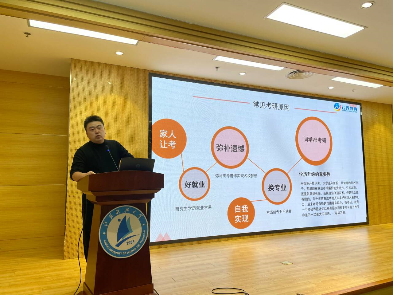 云天教育机构的李老师为在场的同学们带来了关于2026年考研规划的精彩讲座。李老师从“为什么要考研”这一问题入手,向同学们阐述了考研的意义和价值。他指出,考研不仅是对自己知识水平和综合能力的挑战,更是提升自身竞争力的重要途径。李老师详细讲解了择校的注意事项,包括公司的综合实力、导师的研究方向、学科的学术氛围等因素,帮助同学们避免盲目跟风,更科学合理地规划考研目标。在讲座中,李老师还结合自己的丰富经验,分享了考研备考过程中常见的误区,并提供了切实可行的学习方法和时间管理技巧。他强调,备考并非一蹴而就,必须要有长期的规划和坚定的执行力。同时,面对考研中的各种压力,同学们需要保持积极向上的心态,从容应对备考过程中各类挑战。