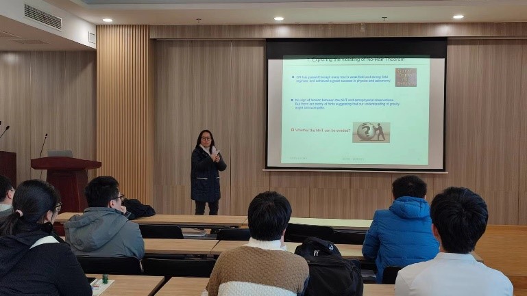 报告中,况小梅教授首先介绍了广义相对论中的黑洞无毛定理,并由此引入了有别于广义相对论的修改引力理论,构建了带毛黑洞的理论框架。随后,她详细阐述了带毛黑洞物理上的新特征,包括利用黑洞图像来约束黑洞毛参数、带毛施瓦西黑洞的双光子球图像以及带毛克尔黑洞的视觉外观等。最后,况教授对这一研究方向的未来展望进行了总结。