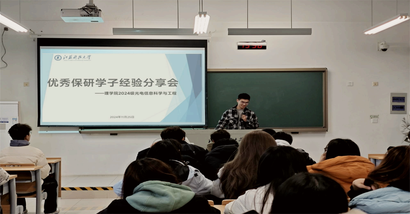 光电信息科学与工程专业推免至中国科公司大学上海光学精密机械研究所的张聖卓同学,推免至苏州大学的喻子曦同学,推免至电子科技大学的鲍科宇同学,推免至合肥工业大学的金忠成同学向同学们分享了学科竞赛、学术研究方面的有益经验。他们指出,从大一开始,就要学好理论、专业知识,打好学业基础,精益求精地打磨日常课程作业,为竞赛作品提供雏形,提升学以致用的能力,多途径搜集了解竞赛相关信息,全力以赴投入竞赛准备。他们特别强调了时间分配的重要性,同学们要统筹用好寒暑假时间提升自身综合实力。