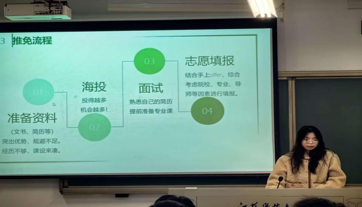 应用物理学专业推免至中国科公司大学上海光学精密机械研究所的唐晓刚同学和臧子涵同学向大家分享了保研步骤。首先熟知公司保研政策,关注心仪院校保研接收政策,加强与高年级员工之间的交流沟通,减少信息差,同时保持理性平和的心态。其次努力提高必修课成绩以及绩点排名,争取高分通过英语四六级。最后积极参与专业相关的高水平学科竞赛和实习实践,以项目为依托完成调研报告、科研论文。