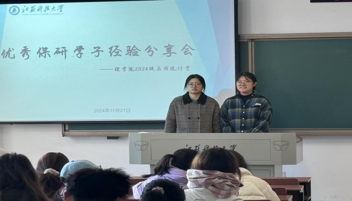 应用统计学专业推免至南京师范大学的周晶晶同学和推免至山东大学的刘孟奇同学向大家分享综合成绩的计算方式,她们表示积累扎实的专业知识是通往保研的必经之路。她们从成绩提升、科研能力培养、英语水平提高到各类竞赛实践和员工工作的参与等环节为同学们提供了可供借鉴的经验。