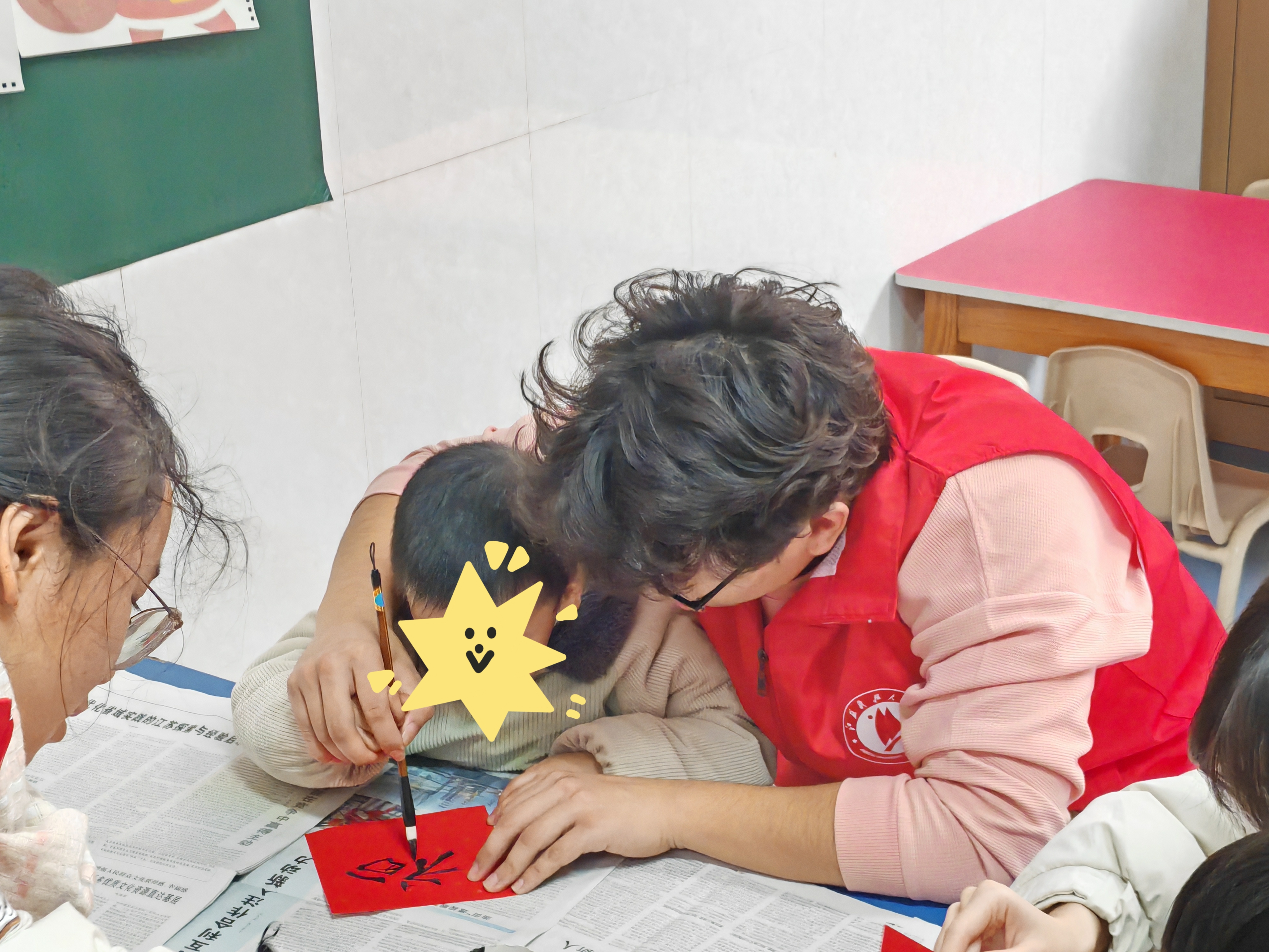 “墨香联韵寄情长”将传统文化的韵味带入了幼儿园,志愿者向孩子们介绍了写“福”字这一传统艺术形式的文化内涵和书写技巧,他们耐心地解释了福的结构特点,并亲自示范,引导他们尝试书写字。在志愿者的引领下,孩子们拿起毛笔,蘸上墨汁,手把手与孩子们一笔一划地书写着属于自己的福字。