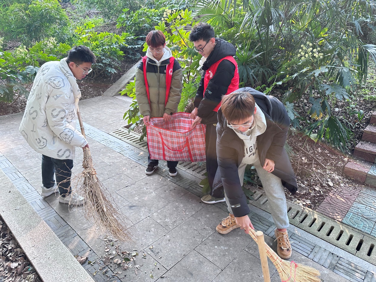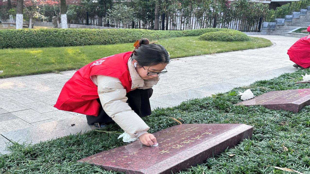在实践团徐瑞的指挥下,成员们纷纷拿起准备好的清扫工具,开始清扫陵园。他们分工明确,配合默契,清扫了道路上的落叶和角落的杂物。每一个动作都认真细致,仿佛在向先烈们诉说着对他们的敬重。清扫过程中,成员们动作轻柔,生怕惊扰了沉睡的烈士。经过一番努力,陵园的道路和广场变得干净整洁。