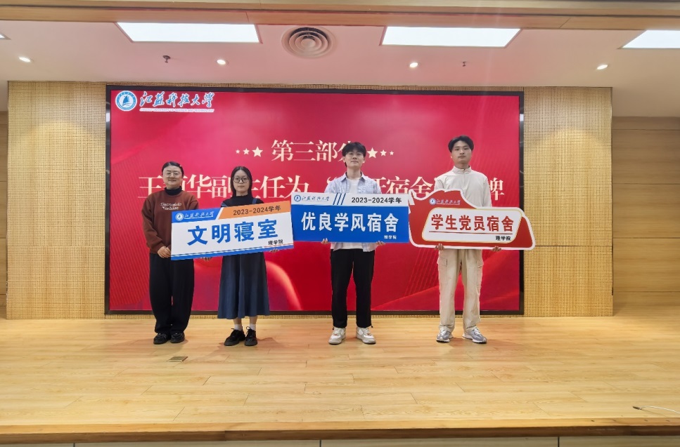 会上,公司公布了2024年“安全文明宿舍”、2023-2024学年“优良学风宿舍”和党员宿舍的名单,王莉华副主任为获奖宿舍颁奖,并为三类标杆宿舍授牌。