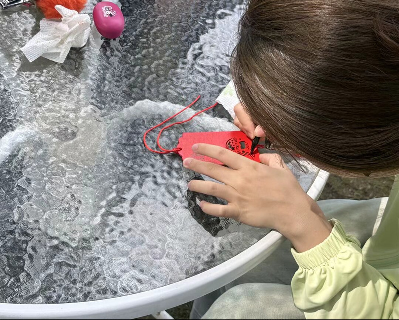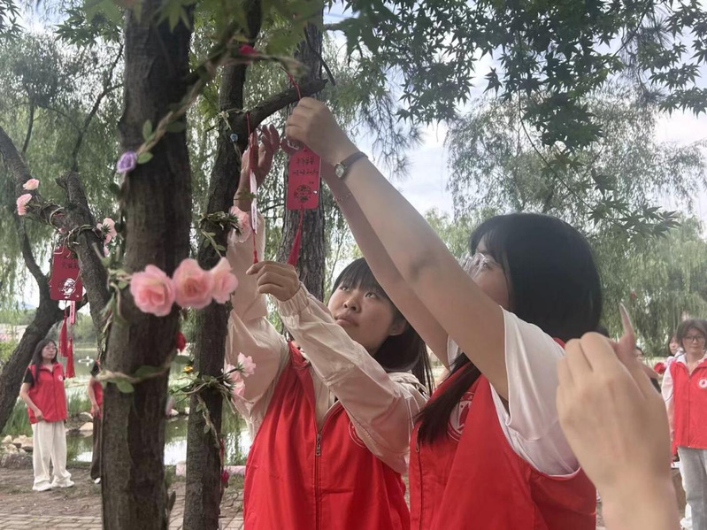 装饰与清理同步推进,现场忙碌而有序。完成后,参与者在特制卡片上写下环保心愿——“愿湖清树绿常在”“用行动守护绿水青山”,并将卡片挂在树枝上,与整洁的环境、绚丽的树木相映成趣。
