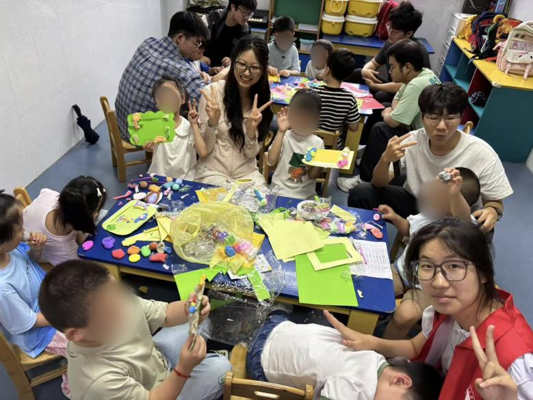 到达小天使康复中心后,全部成员兵分两路,在特教老师引导下,志愿者与孩子们结对相识。随后的黏土画相框制作环节,志愿者采用“我做你看、你做我帮”的分步引导,从揉捏超轻黏土锻炼手部协调性,到用卡纸拼贴构图激发想象力。孩子们在志愿者触觉示范下,将彩色黏土捏成不同形状,兴奋地向同伴展示作品。
