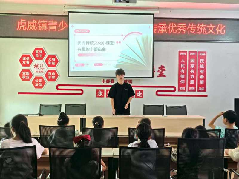 在重庆市,团队成员舒智豪在虎威镇家庭教育互助会带来了一堂别开生面的非遗文化课。他围绕国家级非物质文化遗产“丰都庙会”,通过生动的案例和有趣的互动,为当地的孩子们解码了其独特的民俗仪式与特色活动 。“守护非遗就是守护我们的根脉,”舒智豪表示,“希望通过这样的方式,能让传统文化的种子在孩子们心中悄然扎根。