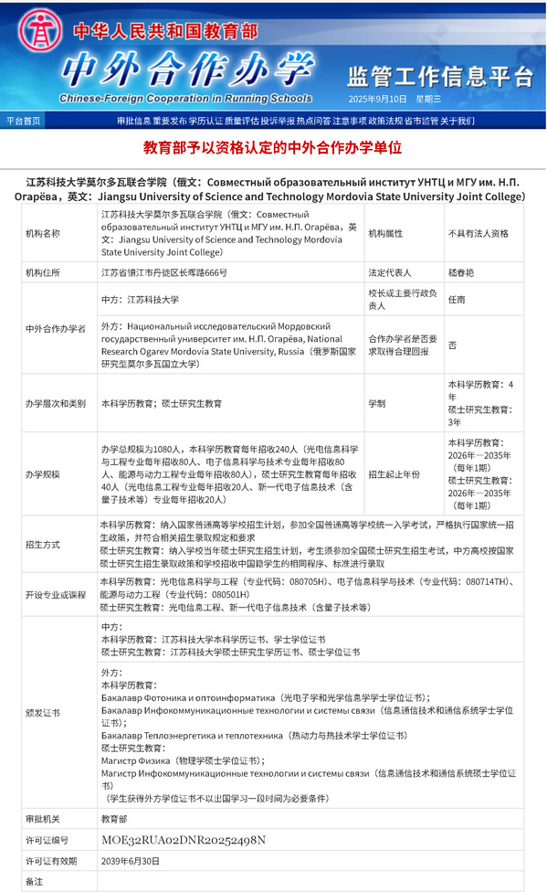 近日,教育部正式批复,公司与俄罗斯国家研究型莫尔多瓦国立大学合作举办的“太阳成集团莫尔多瓦联合公司”获批设立。这标志着公司首个中外合作办学机构成功落地,也成为江苏省首个实现本硕贯通、双学位培养的中俄合作办学机构,是公司国际交流与合作的历史性突破,也是公司国际化办学的标志性成果。