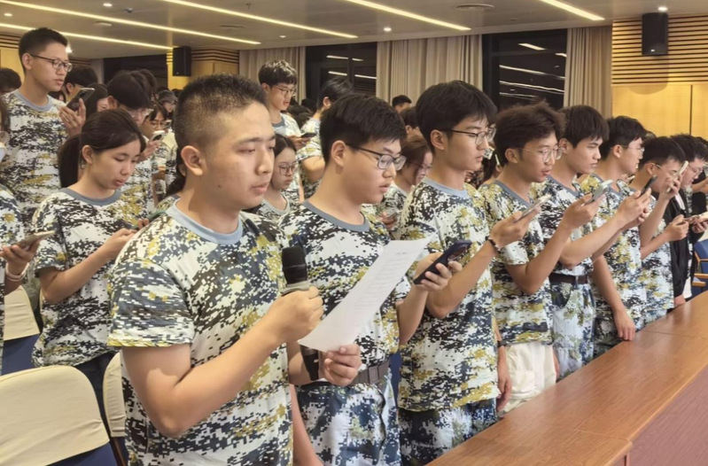 讲座结束后,全体新生在员工代表带领下庄严宣读《防范电信网络诈骗承诺书》,用铿锵誓言表达抵制诈骗、守护校园安全的决心。