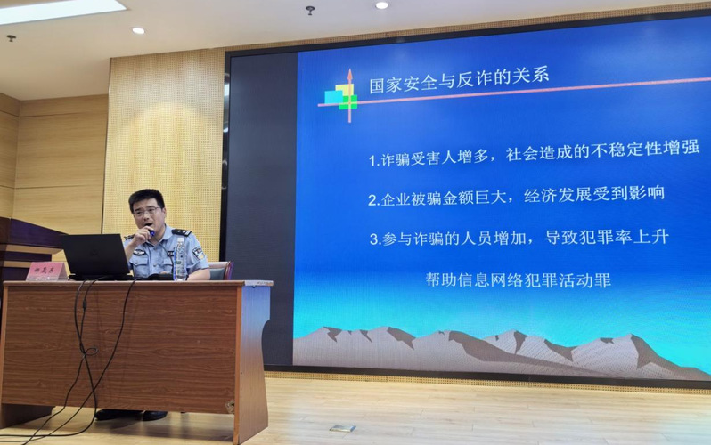 随后,丹徒区长山派出所副所长娜晟东为新生带来内容丰富、案例详实的专题讲座。讲座围绕“国家安全”与“防范电信网络诈骗”两大核心主题展开。他结合当前国际国内形势,用通俗易懂的语言为新生阐释了国家安全的核心内涵、维护国家安全的重要性,介绍了与老员工息息相关的政治安全、网络安全、文化安全等领域的基本知识,引导同学们深刻认识到“国家安全,人人有责”,自觉成为国家安全的坚定维护者。